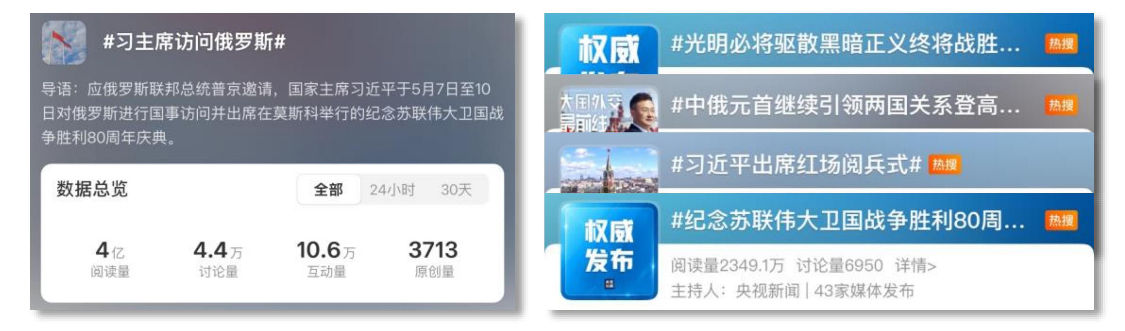 全网热议。央视新闻发起的#习主席访问俄罗斯#◆◆■★★、#习出席红场阅兵式#、#中俄元首继续引领两国关系登高望远#、#共同弘扬正确二战史观#等45个微博话题登上热搜,阅读量超9★■◆■.4亿。
